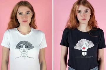 The collection of T-shirts feature monochromatic designs include abstracted portraits of curly-haired ladies and a bug-eyed monster. The tees are all made in Los Angeles and are priced 85 dollars each.