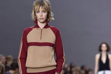 Chloe mixed a long floaty skirt studded with small flowers and a two-colour tracksuit top, or wide black pants with sleeveless t-shirts. The label's British artistic director Clare Waight Keller also paired jogging pants with zipneck tops, and -- for a more feminine look -- matched the same trousers with sleeveless tops or a white transparent blouse.