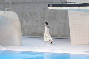 The Serpentine Pavilion provided the backdrop for Roksanda Ilincic’s first in-person presentation post-lockdown. Dancers, rather than models, brought the vividly hued collection to life in an immersive performance designed to show the movement of the garments. A mix of structured and unstructured, voluminous, billowing dresses were accompanied by corset boning and exaggerated cuff and hemline forms. Brush stroke prints and the loose threads between layers of organza bonded with plasticised coatings added to the sense of drama and creative flare.